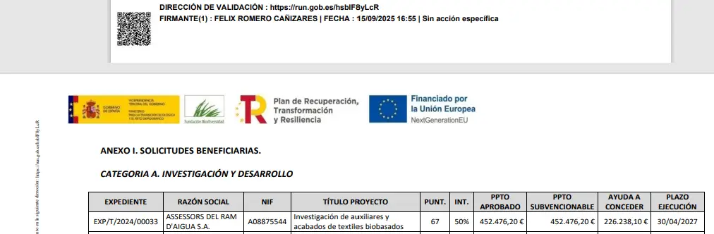 ADRASA has been selected as a beneficiary of PERTE Textile, in Category A: Research and Development, an initiative promoted by the Ministry for the Ecological Transition and the Demographic Challenge, through the Biodiversity Foundation.